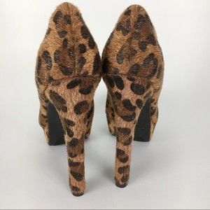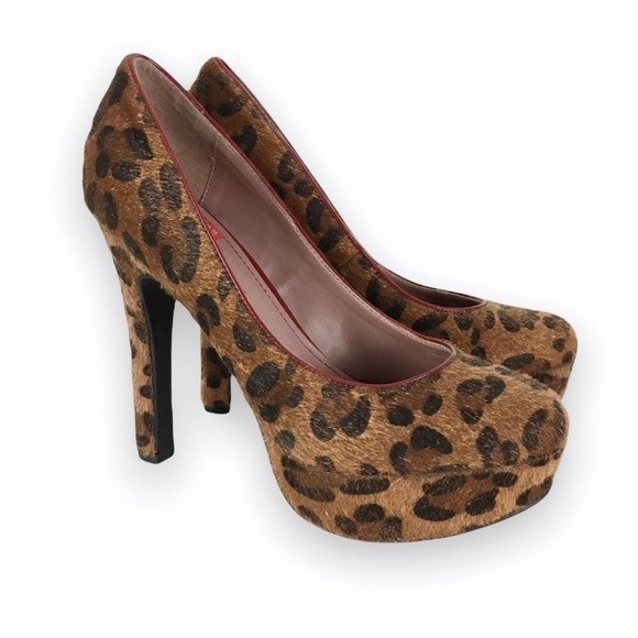 Pink & Pepper vegan / faux fur animal cat leopard cheetah print platform high heels / pumps. Platform is approximately 1.25" high and heel is approximately 5.5" high. Size 8.5 | 8 1/2. Preowned, in great condition.