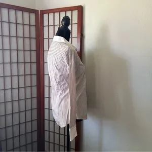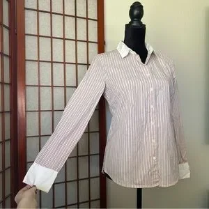 Pink and white J Crew Haberdashery Refined stretch J crew vertical pinstripe button up shirt. White cuffs and collar. Cotton spandex blend. Size small.