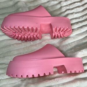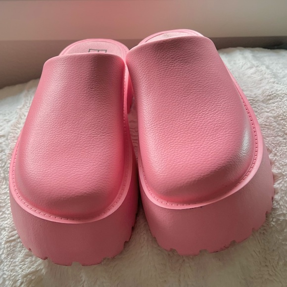 Stylish pink platform clogs. Perfect for casual wear.