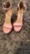 platform heels with a chunky heel. Features a soft pink suede finish. Adjustable ankle strap for a secure ankle