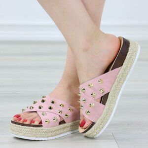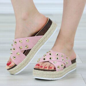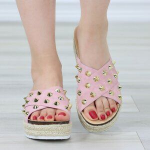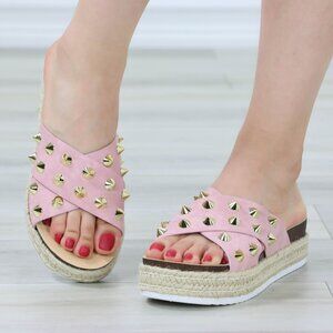 Pink Platform Sandals Nubuck Espadrille Heel Gold Metal Stud Slip On Sliders