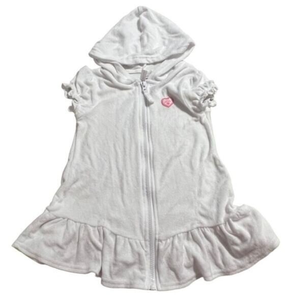 This Pink Platinum Swim Cover for girls, size 3T, is a cute and comfortable addition to any swimwear collection. Made of white terry cotton, it features a full zip front, short ruffled sleeves, and a hood for extra warmth and protection.
