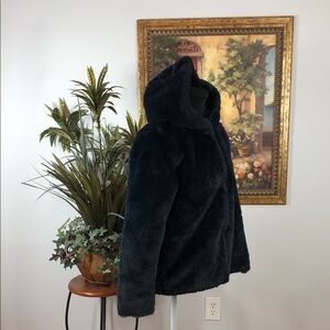 Cozy and chic teddy jacket. Features a plush texture and hood. Ideal for cool weather.