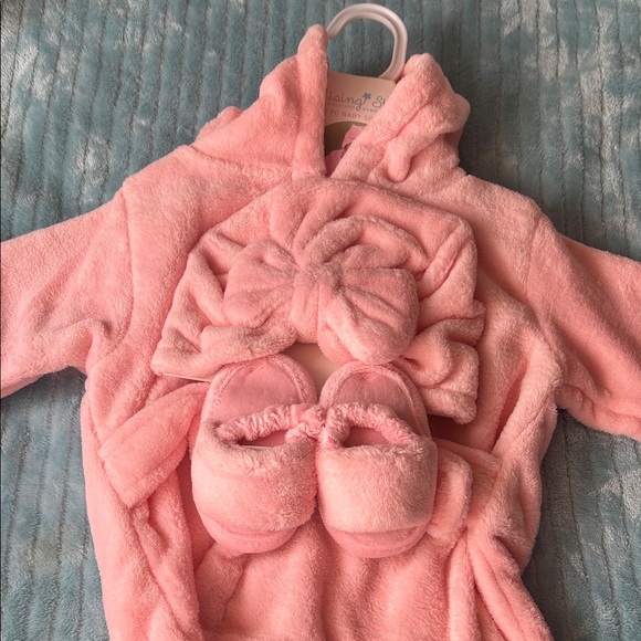 Adorable pink plush baby robe set with matching slippers and headband. Perfect for cozy days.
