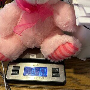 Soft and cuddly, this pink plush bunny is an ideal gift or decoration for Easter celebrations. Its delightful bow and striped ears add charm, making it a lovable companion for children or a whimsical addition to any collection.