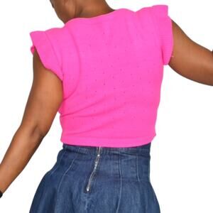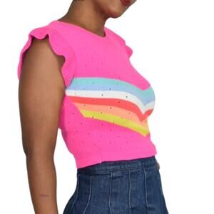 Pink Pointelle Sweater Vest Flutter Sleeve Chevron Rainbow ColorBlock Size Small