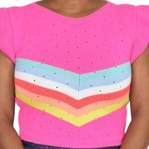 No brand pointelle sweater FEATURES a bright hue and cute girly details. Colorful rainbow chevron stripes in front. Flutter ruffle sleeves. Scoop neck. Cropped length. Pullover.