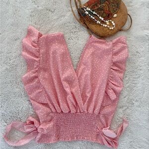 Chic and stylish pink polka dot blouse with ruffle sleeves. Perfect for a casual day out or a special occasion. Runs small, fit a medium.