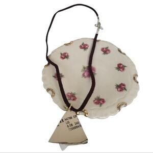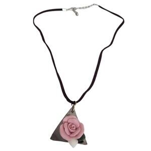 Pink Porcelain Rose Silver Leather Triangle Velvet Necklace