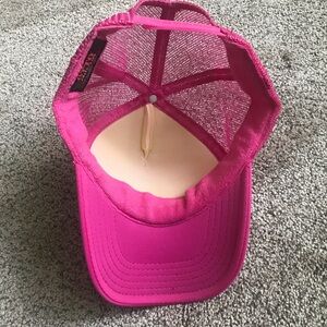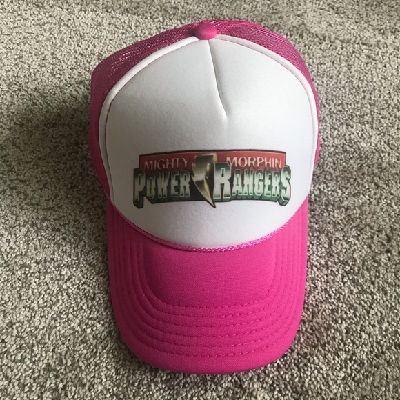 Vibrant pink trucker hat featuring a Power Rangers logo. Perfect for fans.