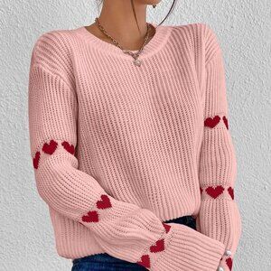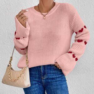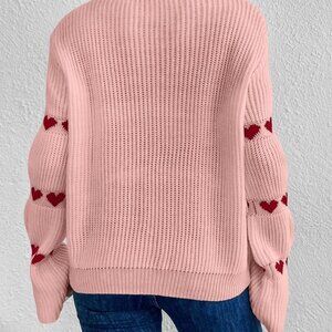 Pink Preppy Womens Heart Pattern Flounce Sleeve Sweater