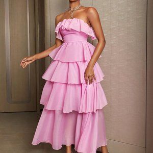 Pink Preppy Women's Ruffle Evening Tube Dress For Cocktail Party