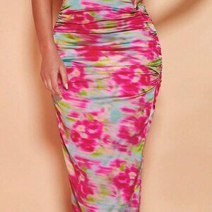 Pink Preppy Womens Tie Dye Print Ruched Bodycon Skirt