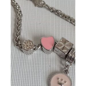 Pink Princess Crown Charm Silver Toned Spiga Chain Hearts and Flowers Bracelet