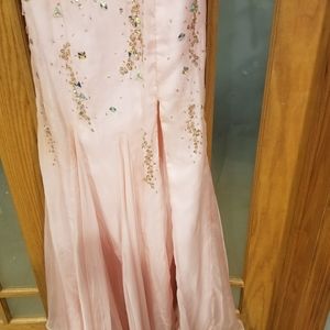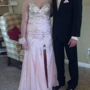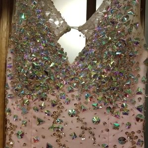 Beautiful embellished pink prom dress. Has a beautiful slit on the left side. A few crystals are slightly lose but those can be threaded again to secure them.