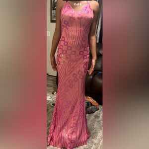 Stylish pink dress with geometric patterns. Perfect for a bold look. Used only once for high school prom.