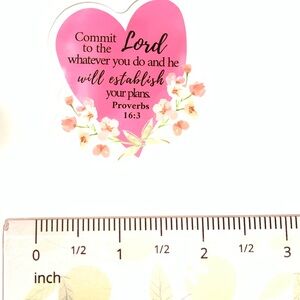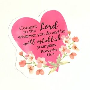 Heart-shaped sticker with Bible Verse. Features a pink background and floral design.