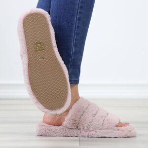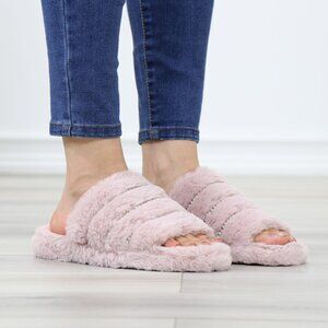 Pink Puff Fuzzy Furry Fluffy Slip On Plush Slippers Diamond Accents
