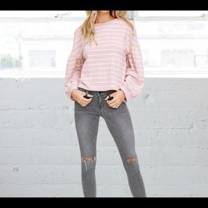 NWT pink crew neck sweater with white stripes. Puff sleeves. Crop length. Stretchy cotton.