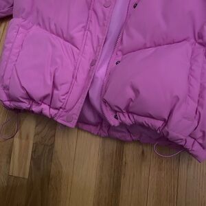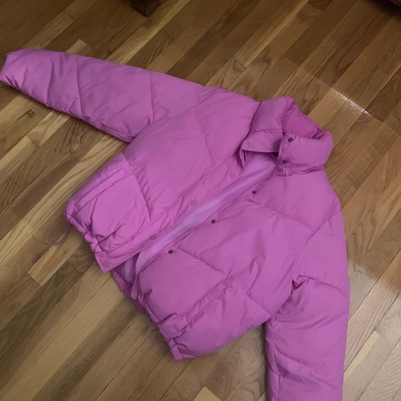 Stylish pink puffer jacket. Perfect for cold weather.