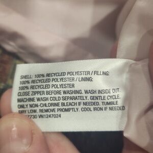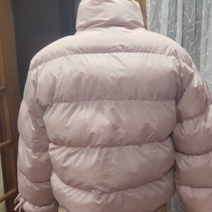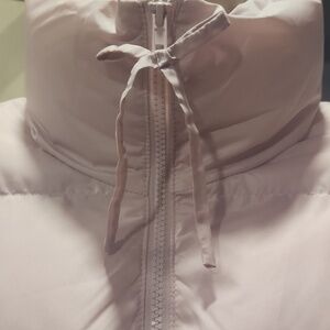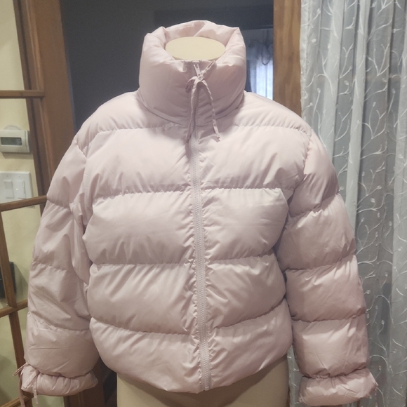 Wild fable pink puffer jacket size XL brand new with tags on it has little bow toe like laces on the arms and on the zipper. Has the two typical pockets one on each side. Its not very warm but definitely spring and fall jacket. Looks nice on..jacket on the shorter side and most likely wont cover your butt lol