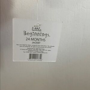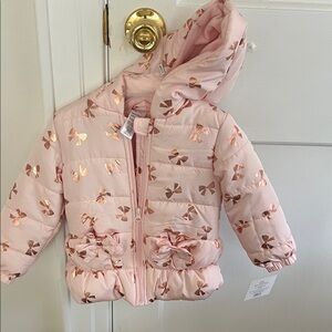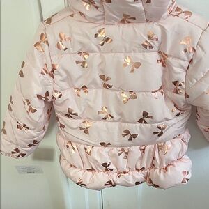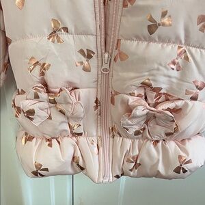 Adorable pink puffer jacket with bow accents. Features a hood and zipper closure.