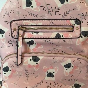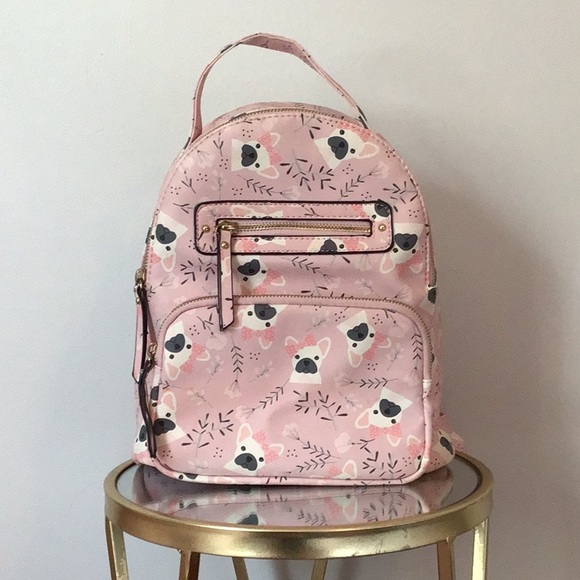 Underonesky Brand pink backpack with a playful pug print and gold colored metal zippers and clasps. Perfect for adding a touch of fun to your style.