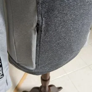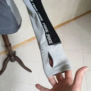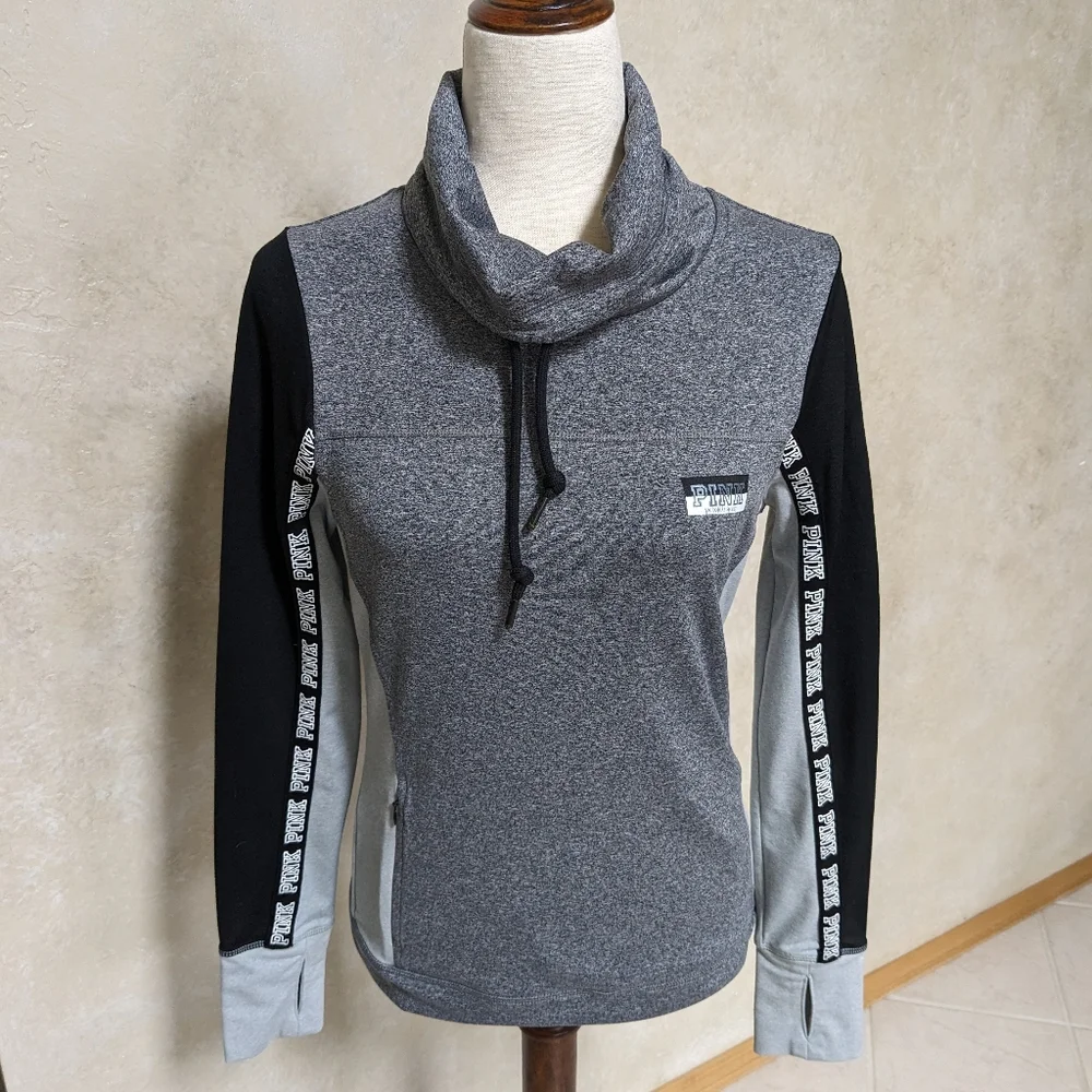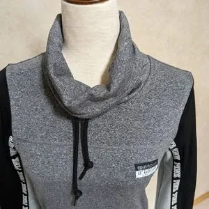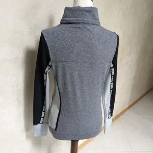 Funnel neck with drawstring pullover has two side zip pockets and thumb holes in the sleeves. 92% polyester and 8% elastane. Heathered grey, grey and black. Excellent condition. Smoke free home. Same day shipping.