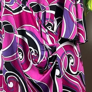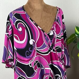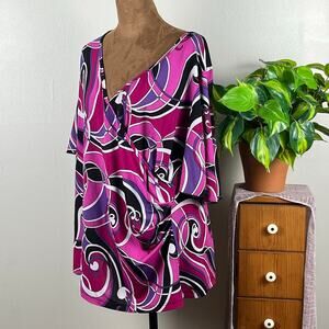 Pink, Purple, Black and White Abstract Designed V Neck Faux Wrap Top XL