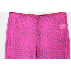 Vibrant pink and purple psychedelic mesh pants . Sheer mesh fabric with flared legs and allover trippy print. Pull-on style—perfect for festivals, concerts, or standout rave outfits.