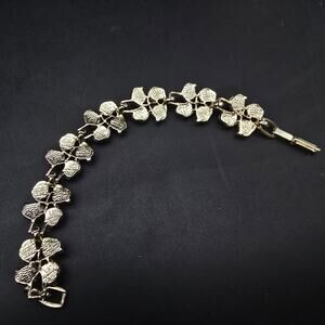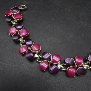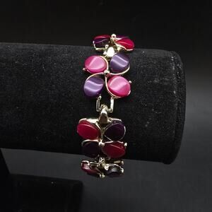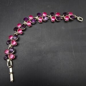 This vintage thermoset bracelet features magenta pink and purple leaves in light gold tone metal and fits up to an 8" wrist