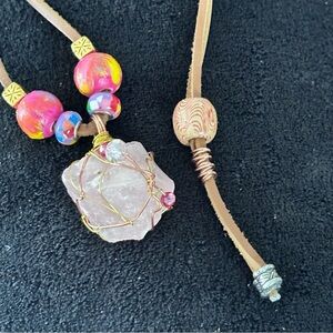 Beautiful handmade necklace made with large pink quartz stone wire wrapped with a leather cord. Adjustable can be worn by male or female brand new one-of-a-kind, no duplicates artisan, handcrafted unique, colorful conversation piece.