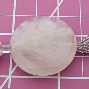 This is one of the prettiest necklaces I've ever seen. It has the loveliest shades of pink that accent the potato pearls beautifully. My pictures don't do this necklace justice. I love the little pink square glass beads and the center stone is beautiful! The natural freshwater potato pearls are real. The large stone tests in the jadeite/spinel section, so I'm not sure what it is. Pre-owned, this necklace is in excellent condition. It measures 27" long.
