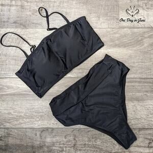 Step into summer with this sleek Pink Queen Bandeau Bikini Swimsuit in a classic black color. Made with a comfortable blend of nylon and spandex, this brand-new bikini features removable straps, offering versatility and style for your beach getaways.