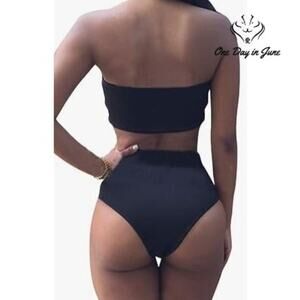 New and bold, this Pink Queen bandeau bikini bears no insignia. Crafted well in black nylon/spandex, it has removable straps, offering a versatility as timeless as the sea itself. A suit for the woman who knows no compromise in style or comfort.