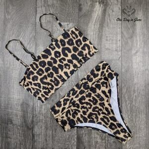 A most becoming leopard print bikini, fashioned with a removable strap for the utmost versatility in your bathing costume. The high-waisted design offers a most flattering silhouette, while the soft fabric blend ensures both comfort and durability for your seaside adventures.