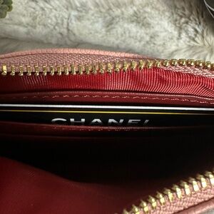 Chic pink quilted bag. Features iconic gold-tone logo and charms. Perfect for elegant outings. Adorable baby pink with added charms in gold and pearls, has slots for CC ‘s and Drivers license, can fit quite a bit inside comes with dust bag, no box.