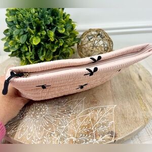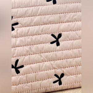 This stylish pink quilted clutch features elegant black accents bows, perfect for any occasion. Its chic design makes it a must-have accessory.