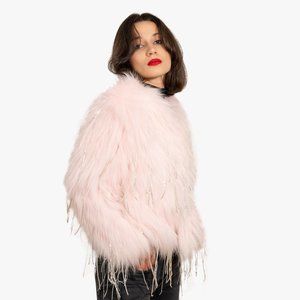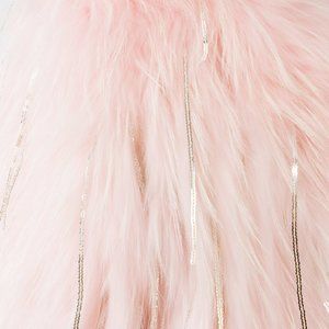 Give your wardrobe some serious attitude! This genuine pink rabbit fur jacket will throw you into the spotlight wherever you go. Striking from every angle, silver sequin strands compliments the fur's soft hue and make will make any of your outfits dazzle. Make a statement this winter.