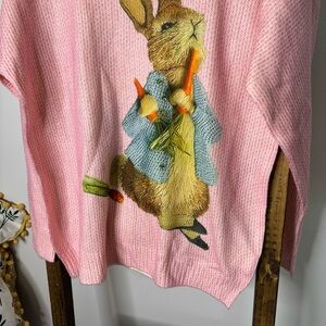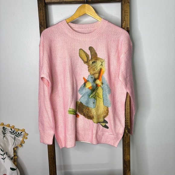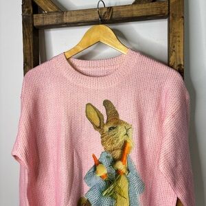 Cozy pink sweater featuring an adorable rabbit design. Perfect for adding a playful touch to your wardrobe.