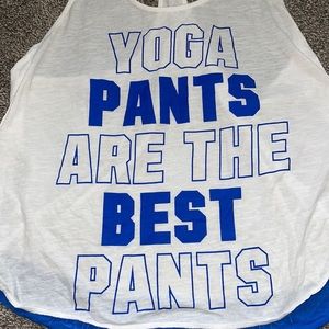 Yoga Pants Are The Best Pants racer back shirt. Blue and white. Racer back with deep slits in the sides as pictured. Victoria Secret Pink!
