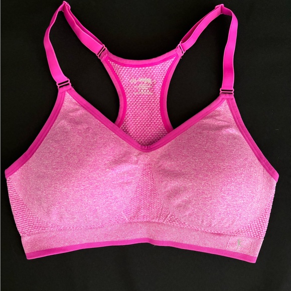 Stay comfortable and stylish with this pink racerback sports bra. Perfect for workouts or everyday wear.