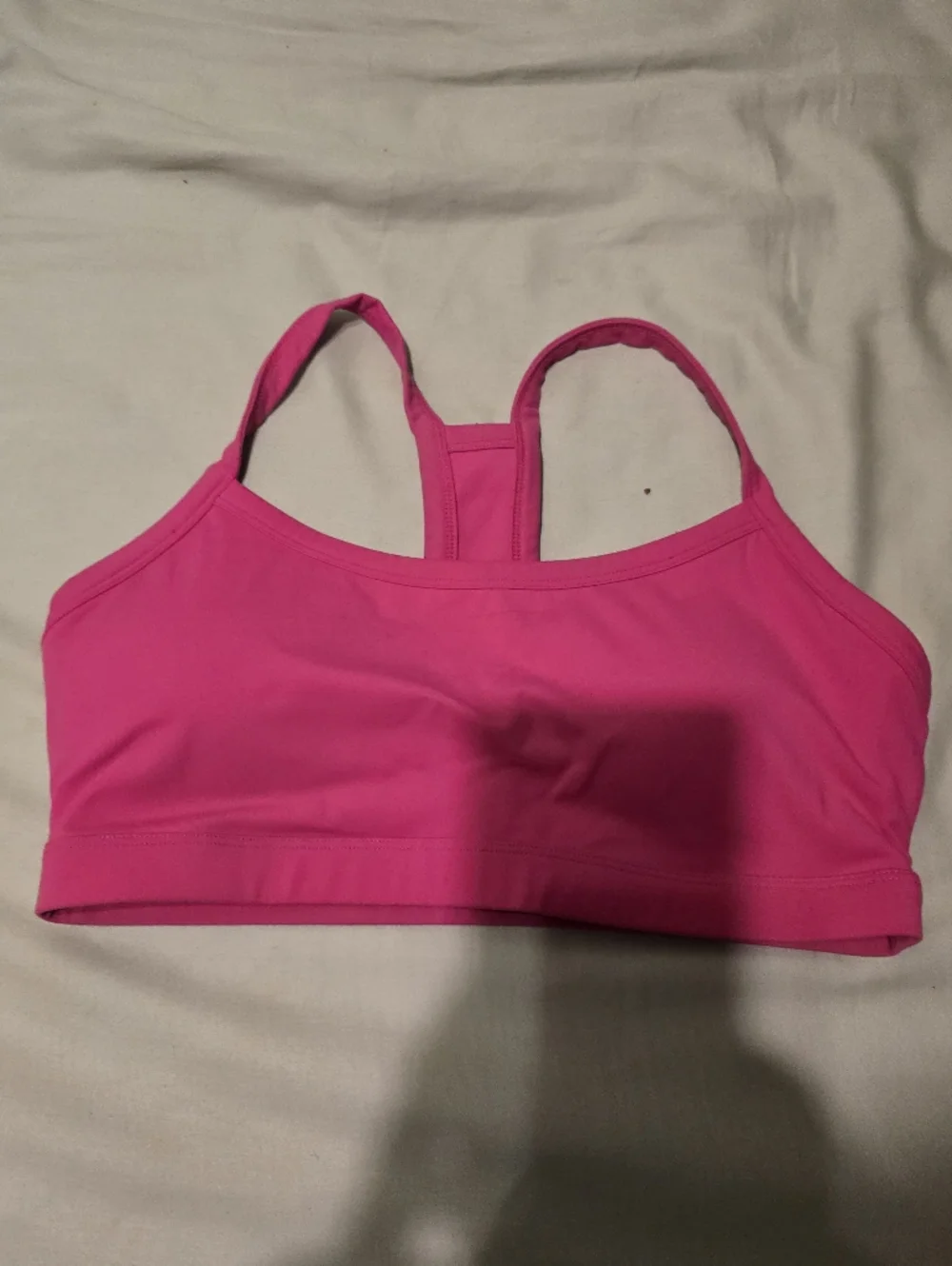 Comfortable pink racerback sports bra for daily wear. Smooth stretch fabric offers light support and a sleek fit. Breathable design keeps you comfortable during workouts or lounging. Easy-care construction for simple maintenance.