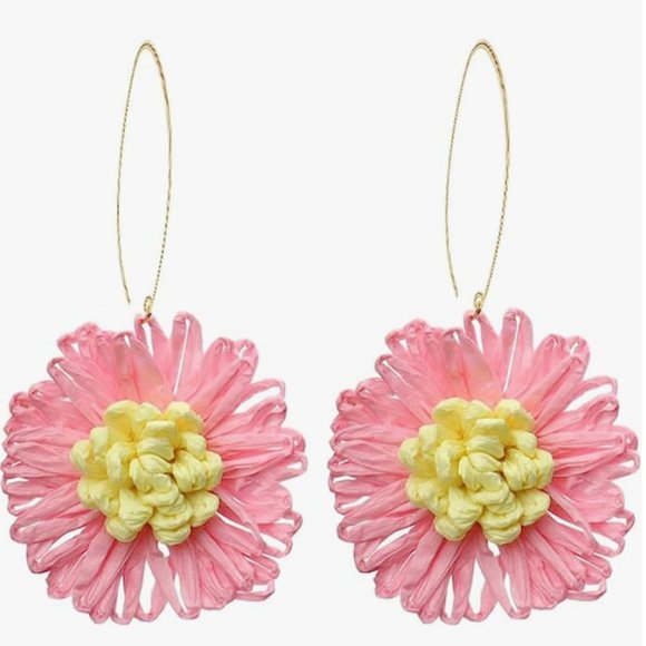 Pink Raffia Flowers Wire Statement Earrings Big Boho Wicker Vacation Flowers New