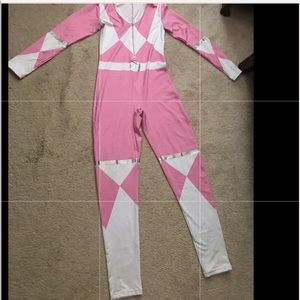 It's morphin' time! This badass Pink Ranger costume is a copy of the original. There's the pink diamond design around the knee and elbow joints and morphin' belt design. The carefully placed white diamonds around the middle accentuate your natural curves with a front zipper closure. Stretchy and comfortable material. Measurements: model is 5'9", 32"-25.5"-36" wearing size small (pics 1-3 are pics to model & the last 2 pics will show tiny flaws, with is a pen point mark) ONLY worn 1x for an hour!