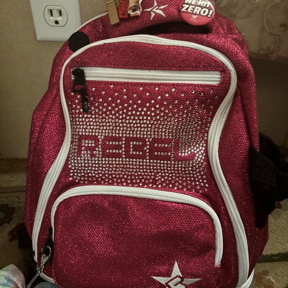Stylish pink backpack with rhinestone embellishments. Features the word 'Rebel' in rhinestones. Perfect for adding a touch of sparkle to your look.
