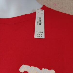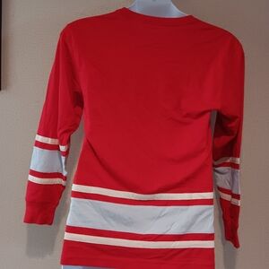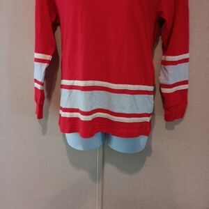 Stylish red long sleeve shirt featuring white and gray stripes. Perfect for casual wear.