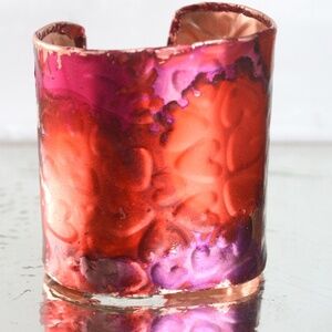 Thank you for looking at this brand new, one-of-a-kind cuff bracelet, handcrafted from solid copper. I embossed the surface with a heart motif, then hand-painted it in a rich mix of red, pink, purple, yellow, and orange patinas, and sealed it to preserve the vibrant finish.