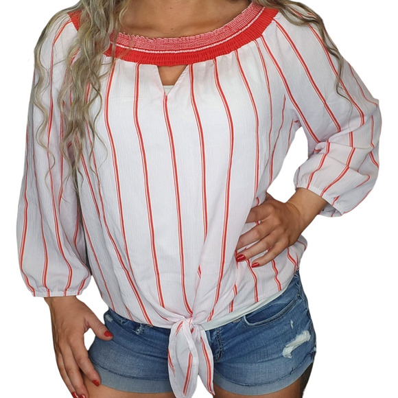 Pink Red Striped Blouse Juniors XXL Front Tie Puff Sleeve Scoop Neck Keyhole