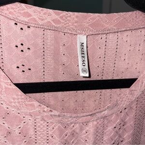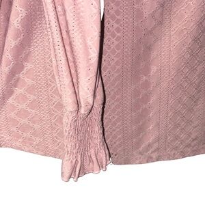 This pink blouse features a relaxed fit with smocked details, offering a comfortable and stylish look. The sleeves are designed with a gathered cuff and a slight ruffle, adding a touch of elegance. Made from a lightweight fabric, it provides an airy feel perfect for any occasion.